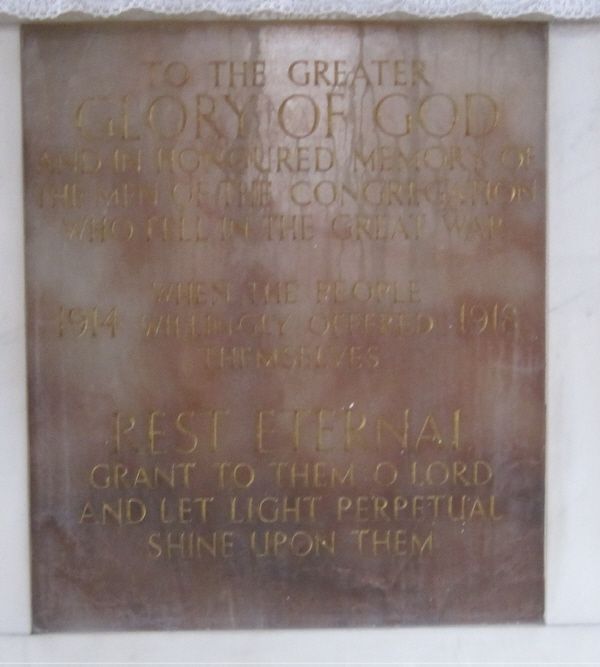 The Blessed Sacrament Chapel contains a memorial to the men of Sparkbrook who gave their lives in the First World War. Some of these men were very local - Walter Bastock lived on Mole Street, for example. See