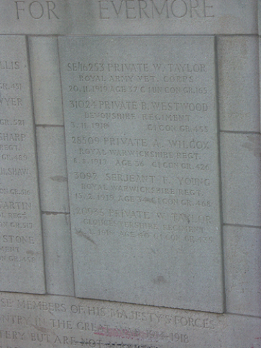 Frank Young is buried in the same grave as another soldier, Private Arthur J. Brine, a married man who also served in the 6th Royal Warwickshire Regiment, and died of his war wounds on 25th February 1919. Arthur was brought up in Wenman Street, and before the war was an assistant caretaker.